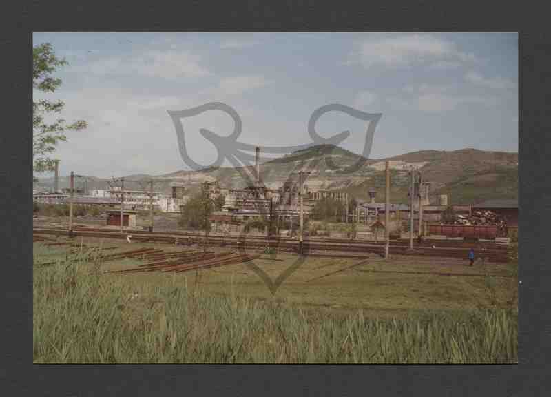 Im Bildmittelpunkt ein leere und verfallende Gebäude, Hinter den Gebäuden bewaldete Hügelkette, darüber hellblauer Himmel; vor den Gebäuden Eisenbahnschienen, davor Felder.