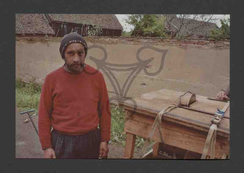 Zu sehen ist eine mobile Tischkreissäge Marke Eigenbau. In der linken Bildhälfte ein bärtiger Mann in dunkelblau-karierter Hose, rotem Pullover und dunkelblauer Mütze. Hinter ihm eine Zaunmauer, dahinter Wirtschaftsgebäude eines Bauernhofs und Bäume.