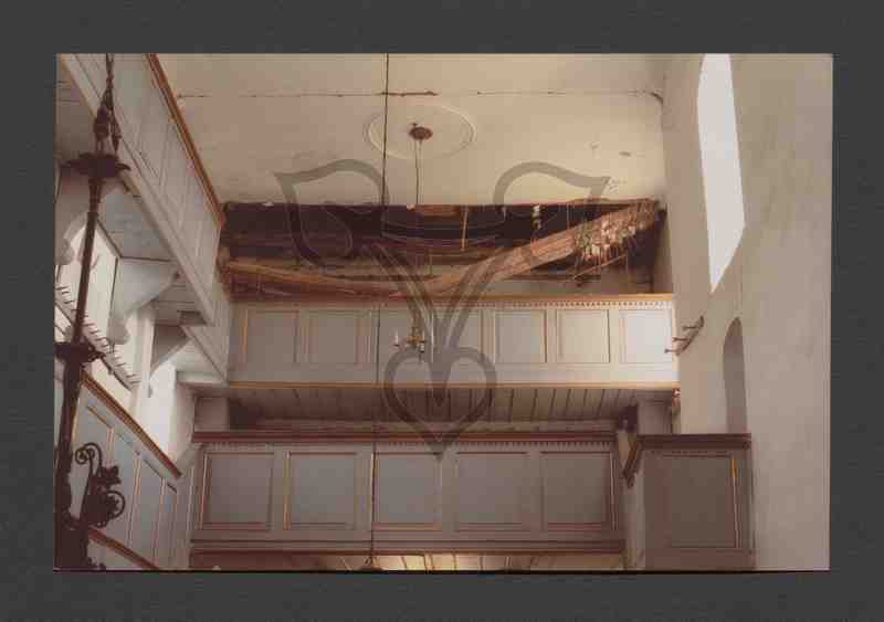 Blick von Ost nach West in den Innenraum der Streitforter evangelischen Kirche. Zu erkennen ist der mit Teppichen ausgelegte Fußboden, das Eingangsportal, die beiden Emporen sowie der hinterste Teil der herabstürzenden Deckenverkleidung.