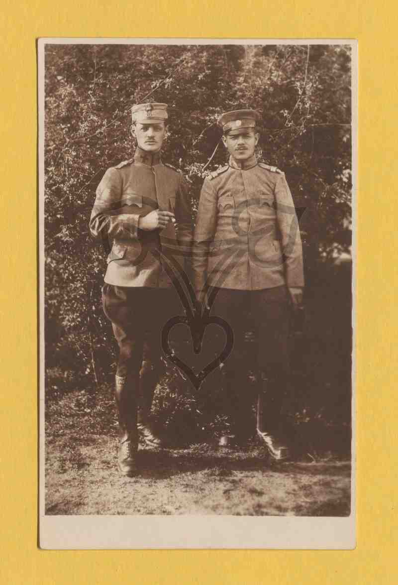 Zwei Männer in rumänischer Uniform (Modell 1912) stehen im Freien vor einem Strauch und blicken in die Kamera. Der linke hält seinen rechten Arm angewinkelt vor der Brust, den Daumen unter der Uniformjacke verborgen.