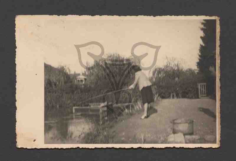 Die Frau, mit dunklem Rock und heller Weste bekleidet, steht am Ufer eines Teiches oder Baches mit einer ausgeworfenen Angelrute in den Händen und hat der Kamera den Rücken zugewandt. Im Hintergrund und an den Ufern Bäume, Gestrüpp und Schilf, in der rechten unteren Bildecke ein Topf, am linken Bildrand hinter den Bäumen Gebäude.