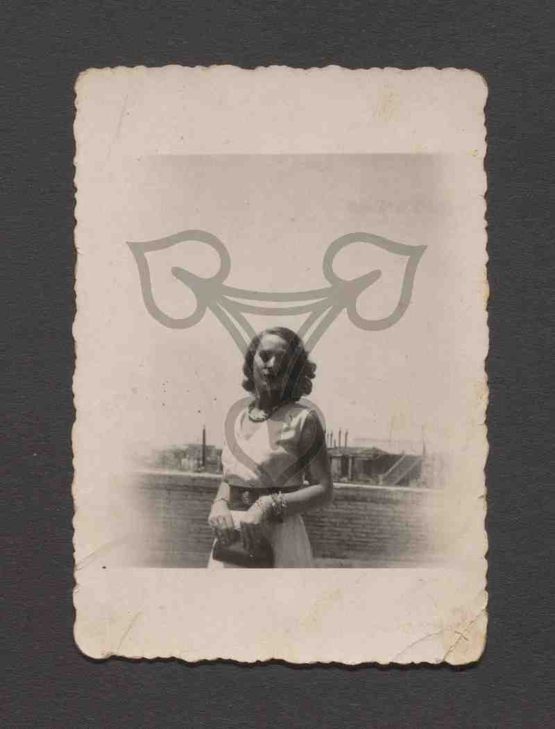 Suzana Lascu trägt ein weißes Kleid mit breitem dunklem Gürtel, mehrere Armbänder, eine dunkle Halskette, hält ein Handtasche in beiden vor dem Bauch zusammengeführten Händen, ist nach links gewandt und blickt in die Kamera. Im Hintergrund eine Ziegelmauer, darüber Dächer von Gebäuden und wolkenloser Himmel.
