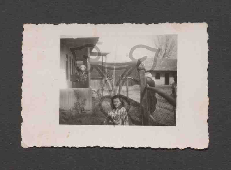 Am unteren Bildrand mittig kniet Suzana Lascu mit einem Blumenstrauß in den Armen in einem Vorgarten. Links hinter ihr ein Bauernhaus, auf dessen Veranda eine ältere Frau steht und in die Kamera Blickt. Rechts hinter Suzana Lascu ein Maschendrahtzaun, dahinter, außerhalb der Umfriedung, ein Mann in dunkler Kleidung und weißer Mütze. Im Hintergrund weitere Wirtschaftsgebäude. Am rechten Bildrand stark angeschnitten, eine weiterer Mann.