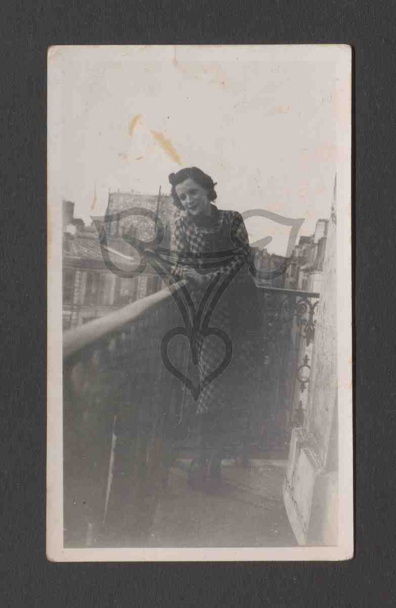 Suzana Lascu steht, bekleidet mit einem hell-dunkel karierten Kleid auf einer schmalen Terrasse eines mehrstöckigen Hauses, ist mit der rechten Seite an Gelände gelehnt und blickt links an der Kamera vorbei auf die Straße.