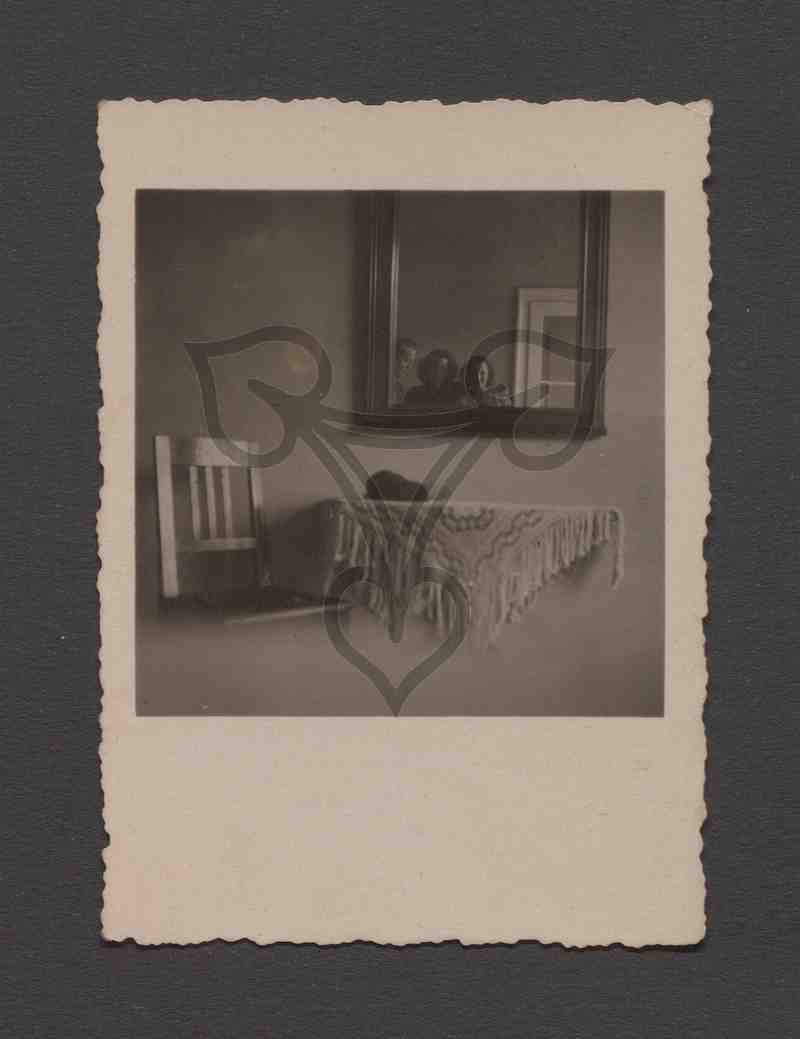 In einem Raum stehen ein Stuhl und ein mit einer bunt bestickten Tischdecke gedeckter Tisch an einer Wand. Über dem Tisch hängt ein Spiegel. In diesem spiegeln sich Suzana Lascu, ein Mann, eine weitere Frau sowie eine Zimmertüre. Identisch mit PB 207/1858.