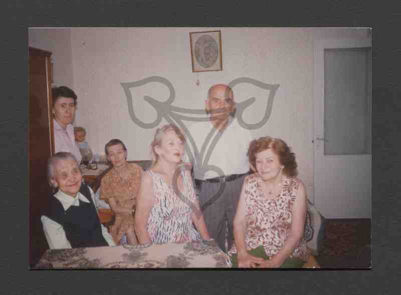 In einem Zimmer sitzen bzw. stehen sechs Personen um einen Tisch (linker unterer Bildrand) gruppiert. Hinter dem angeschnittenen Schrank links verbirgt sich eine Frau, auf dem Sofa hinter ihr sitzt eine Puppe, an der Wand hängt ein Stich. Suzana Lascu sitzt ganz rechts auf einem Stuhl. Zwischen ihr und ihrer Freundin links steht ein Mann. Ganz rechts eine offene Zimmertüre.