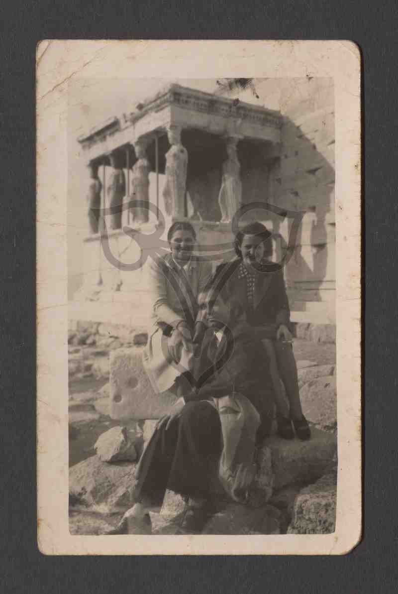 Die beiden Frauen, die linke hell, die linke dunkel gekleidet, sitzen auf einem Steinquader. Vor ihnen ein dunkel gekleideter Mann. Alle blicken sie in die Kamera. Im Hintergrund die Karyatiden des Erechtheions in Athen. Identisch mit PB 207/1880.