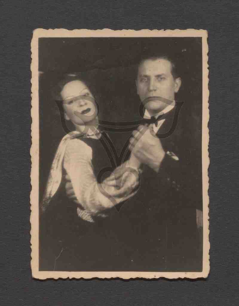 Das Paar, beide in Tanzhaltung, ist überwiegend in schwarz gekleidet und blickt in die Kamera.