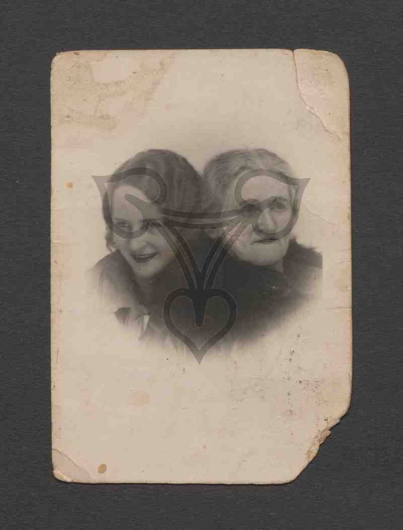 Studioaufnahme, neutraler Hintergrund. Porträt. Die jüngere Frau steht links hinter der älteren und lehnt sich mit ihrer linken Wange an die rechte Schulter der vorderen Frau. Diese ist in einen dunklen Pelz gehüllt und blickt rechts an der Kamera vorbei.