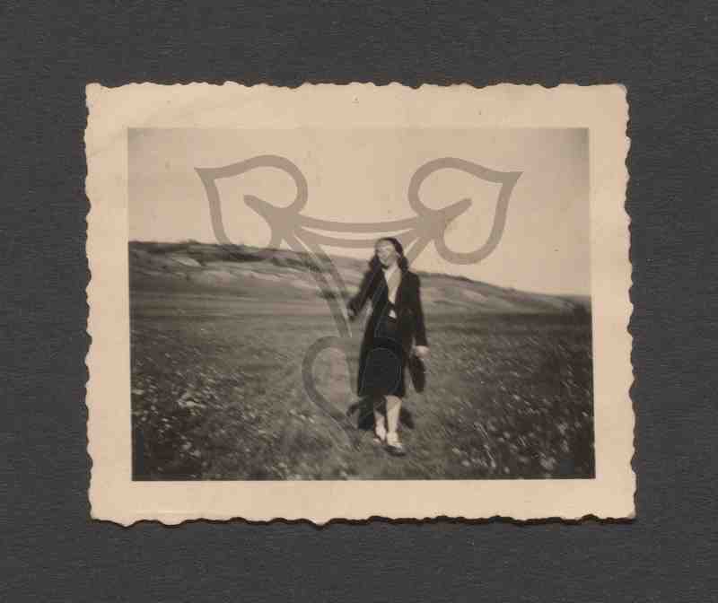 Die Frau, bekleidet mit einem schwarzen Rock, Mantel, weißer Bluse, geht auf einem Feldweg spazieren. Sie trägt eine Handtasche in ihrer linken Hand und wirkt fröhlich.