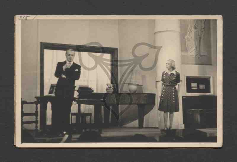 Aufnahme in Theaterkulissen. Zwei Personen, eine Frau links, ein Mann rechts, agieren auf der Bühne im üppigen Bühnenbild.