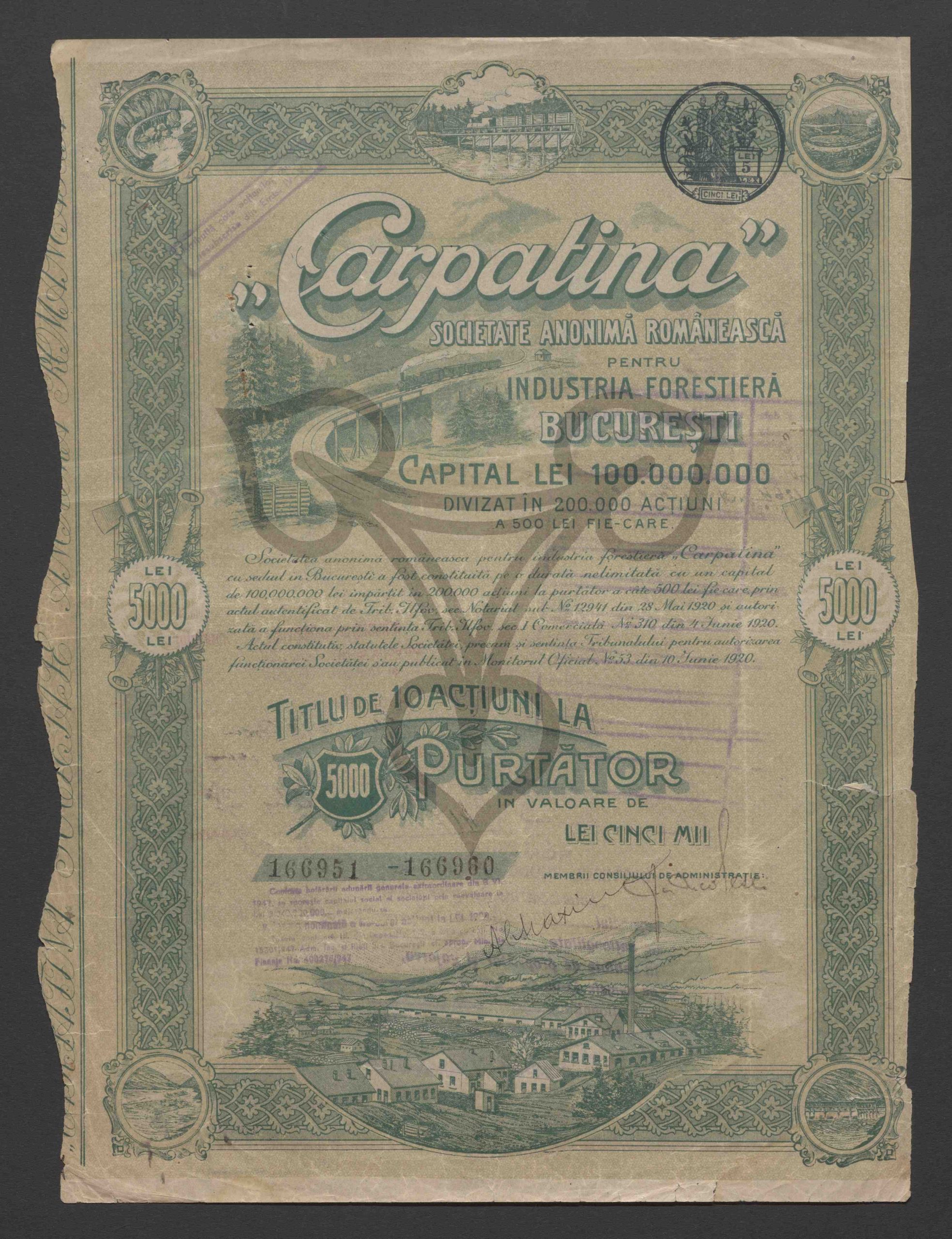 Titel von 10 Inhaberaktien im Wert von fünftausend Lei. Emission IV-V. 166951 – 166960