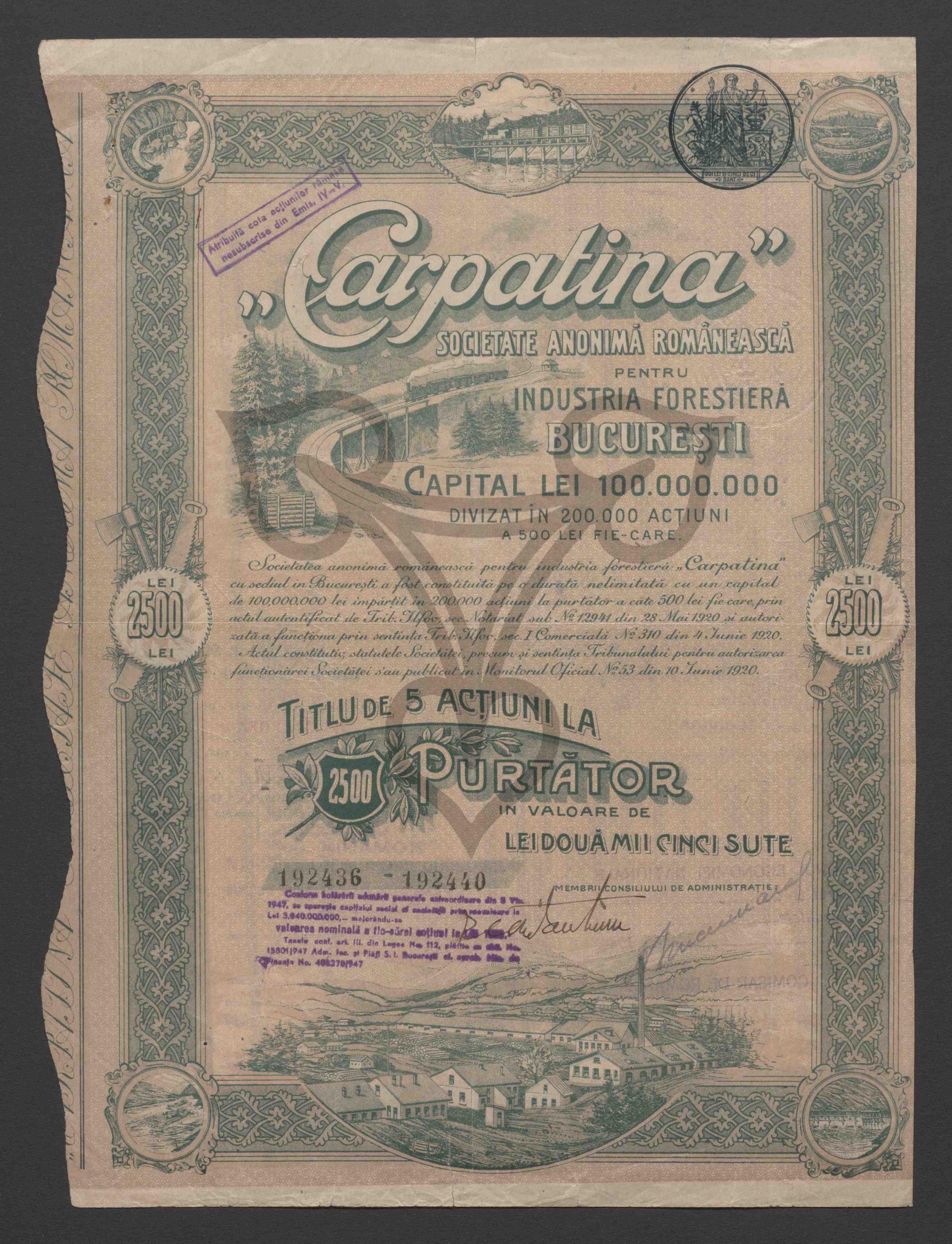 Titel von 5 Inhaberaktien im Wert von zweitausendfünfhundert Lei. Emission IV-V. 192436 – 192440