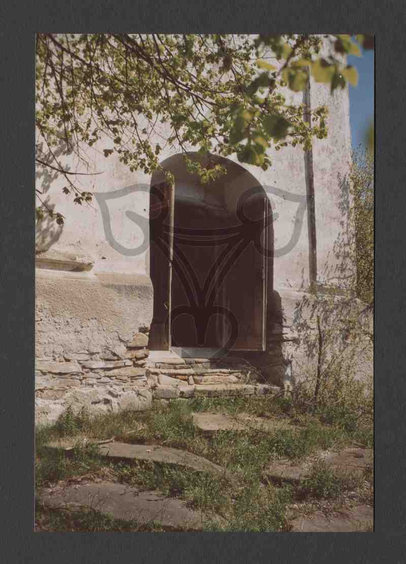 Offene, zweiflügelige Holzpforte, davor Steinplattenpflasterung, zwischen den Platten Unkraut.