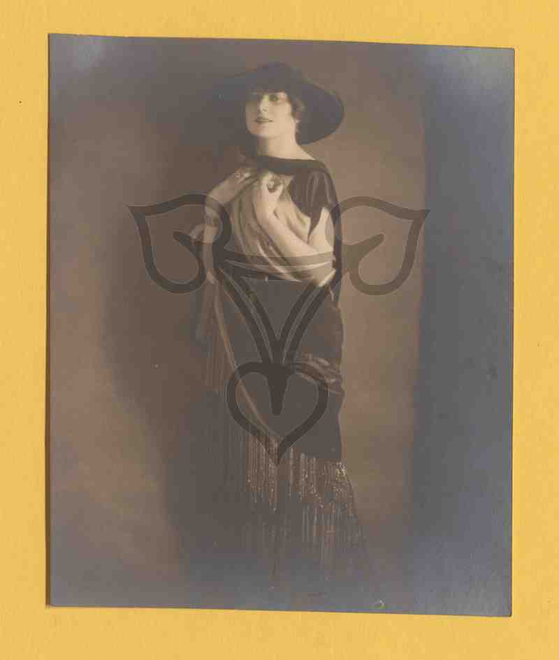 Studioaufnahme, dunkler Hintergrund. Die Frau ist in ein mehrfarbiges Kleid mit weißem Oberteil und silbernem Unterrock und dunklen Überrock gekleidet, trägt einen großen schwarzen Hut, steht nach links gewandt vor einer Wand und blickt in die Kamera. Beide Hände hat sie auf die Brust gelegt.