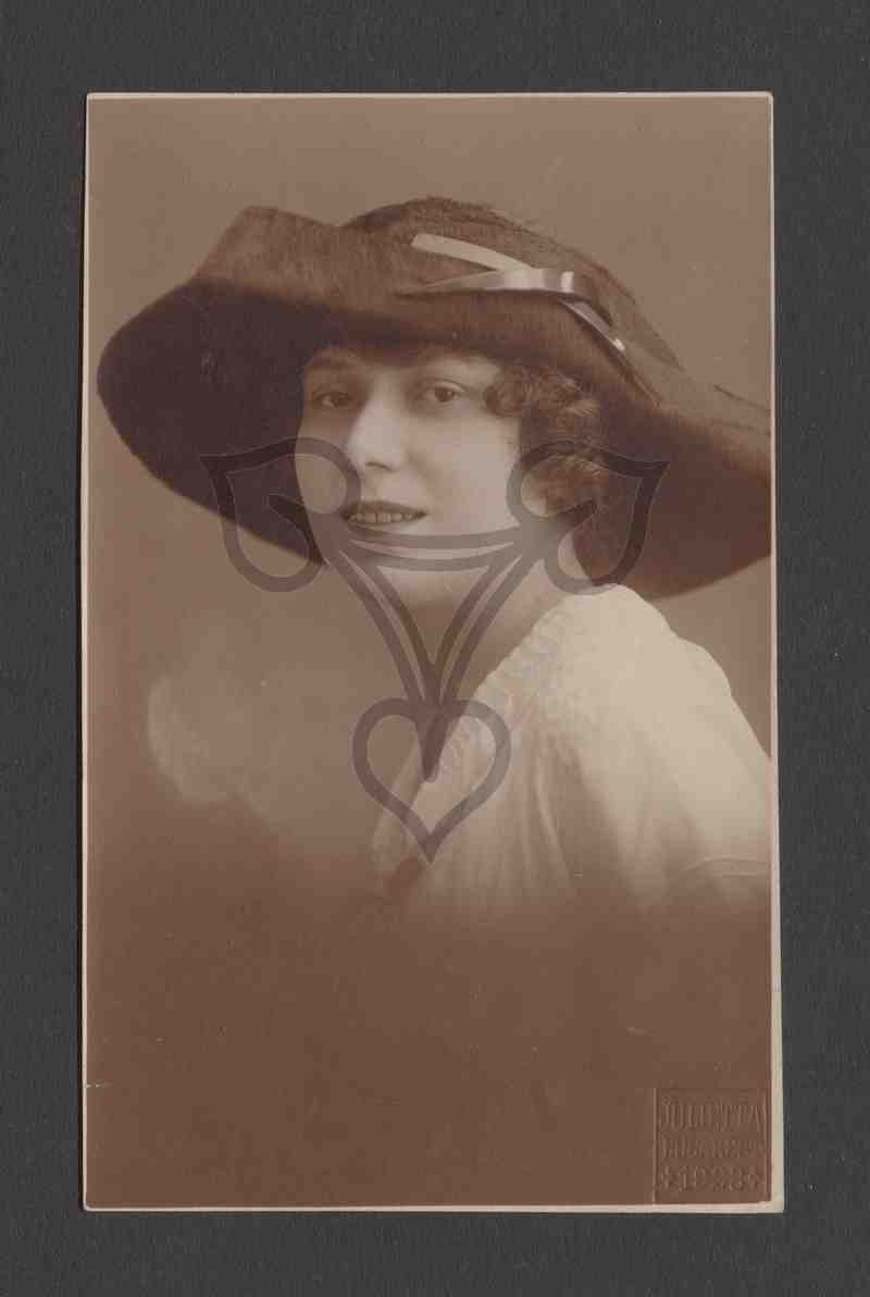 Studioaufnahme, dunkler Hintergrund. Die Frau trägt eine weiße Bluse und eine großen dunklen Hut, ist nach links gewandt und blickt in die Kamera. In der rechten unteren Ecke Prägestempel des Fotografen.