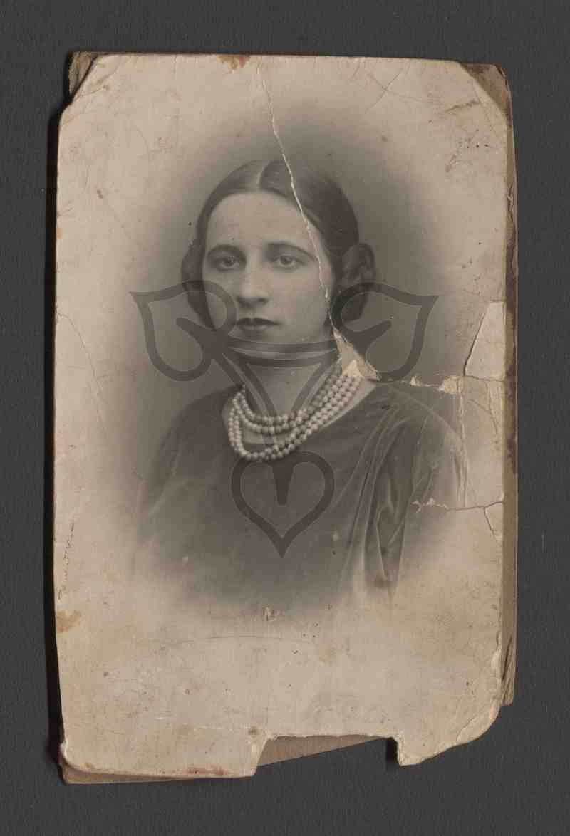 Studioaufnahme, neutraler Hintergrund. Porträt. Die Frau trägt eine schwarze Bluse, eine mehrreihige Perlenkette, ist nach links gewandt und blickt links an der Kamera vorbei.