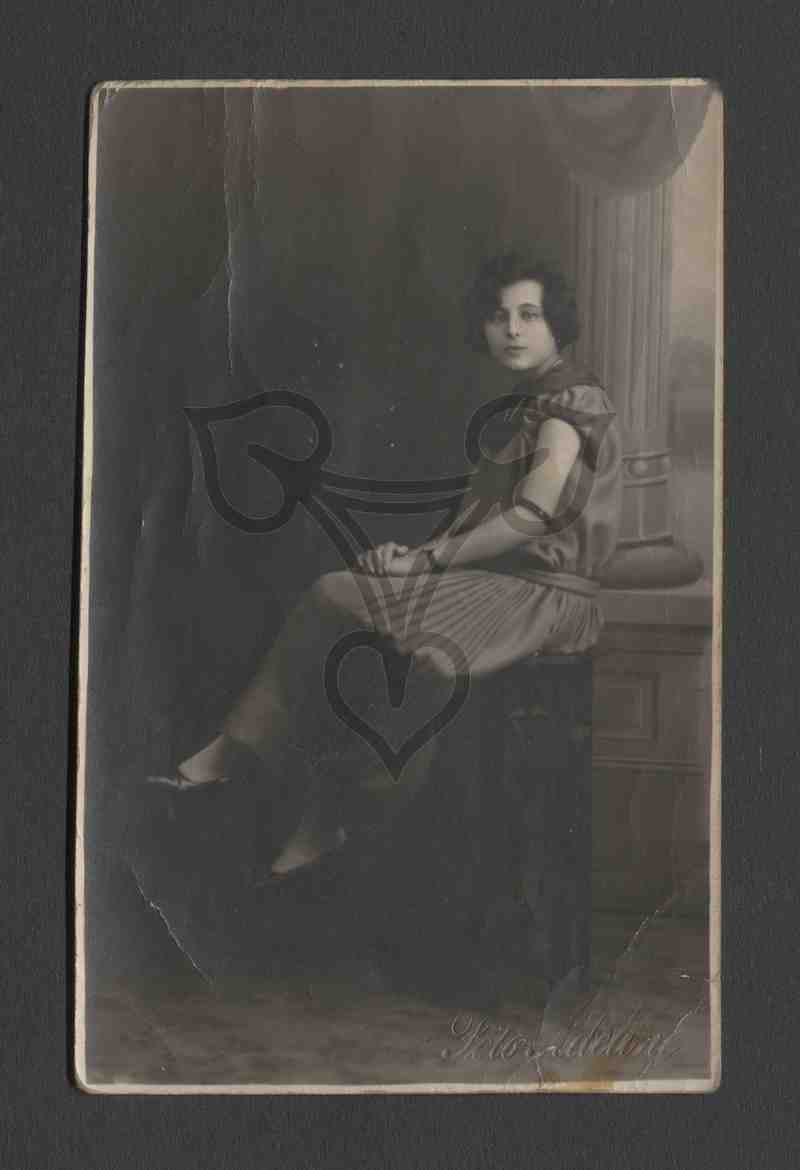 Studioaufnahme, gemalter Hintergrund, Hocker Requisite. Die Frau ist in ein dunkles Kleid gekleidet, trägt schwarze Schuhe, ein dunkles Halstuch und eine Armbanduhr am linken Handgelenk. Sie sitzt auf einem hohen Hocker, hat das linke über das rechte Bein geschlagen, die Hände gefaltet auf die Oberschenkel gelegt und blickt in die Kamera. In der rechten unteren Ecke der nicht lesbare Prägestempel des Fotografen.