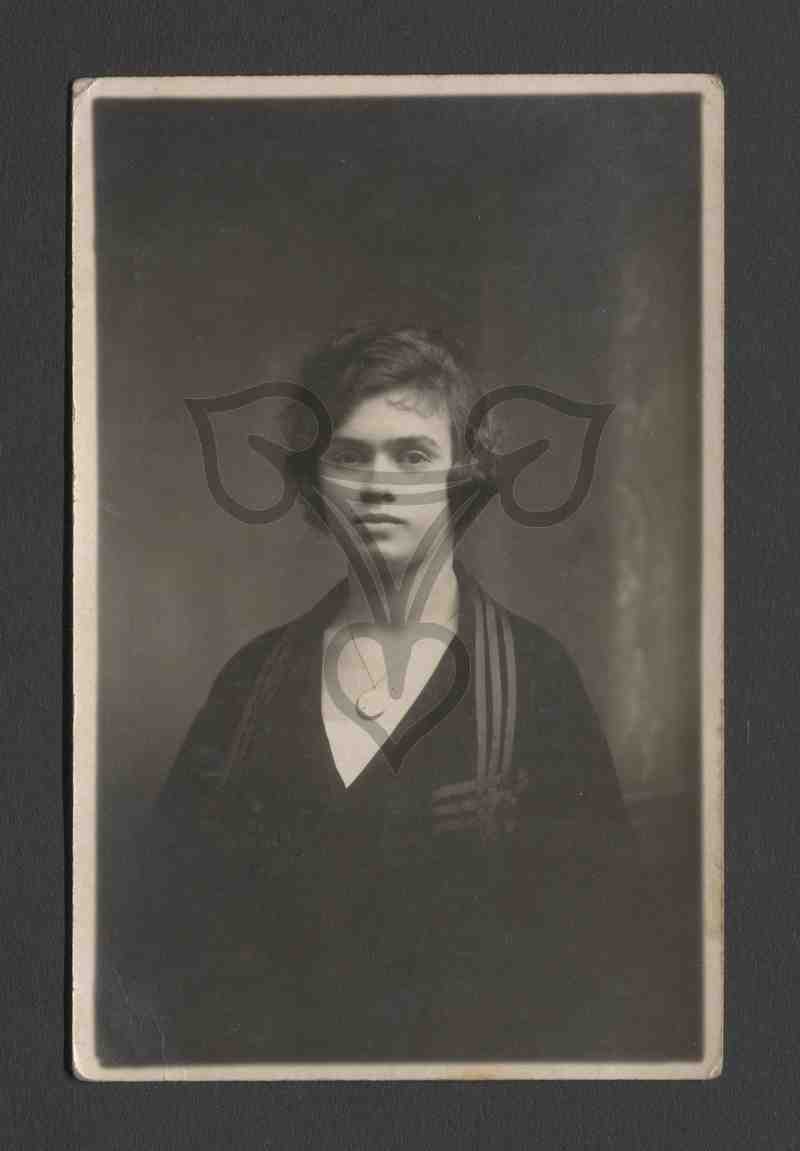 Studioaufnahme, gemalter Hintergrund. Halbbrustporträt. Die Frau ist in einem schwarzen Kleid mit weißem Unterhemd bekleidet, trägt eine Halskette mit Brosch und blickt in die Kamera.