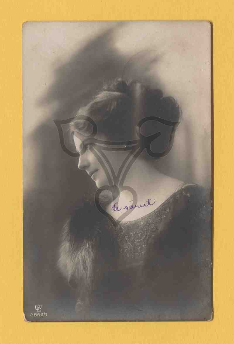 Studioaufnahme, neutraler Hintergrund. Halbbrustporträt. Die Frau ist in eine reich bestickte und an den Schultern mit Pelz verbrämte dunkle Bluse gekleidet, nach links gewandt und blickt nach links.