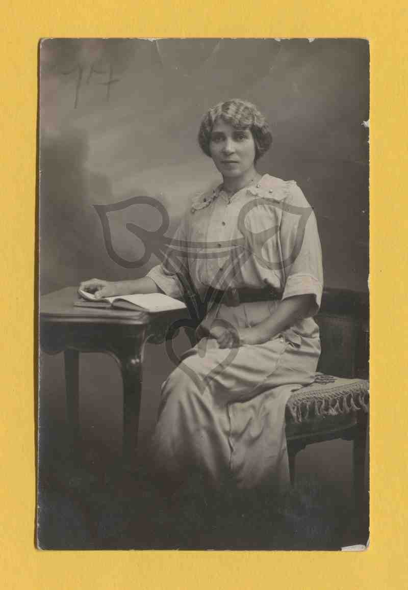 Studioaufnahme, gemalter neutraler Hintergrund, Hocker, Tisch und buch Requisiten. Die Frau sitzt auf einem Hocker nach links gewandt und blickt in die Kamera. Der linke Arm ist auf dem Oberschenkel gelegt, der recht hält ein auf der Tischplatte liegendes Buch aufgeschlagen.