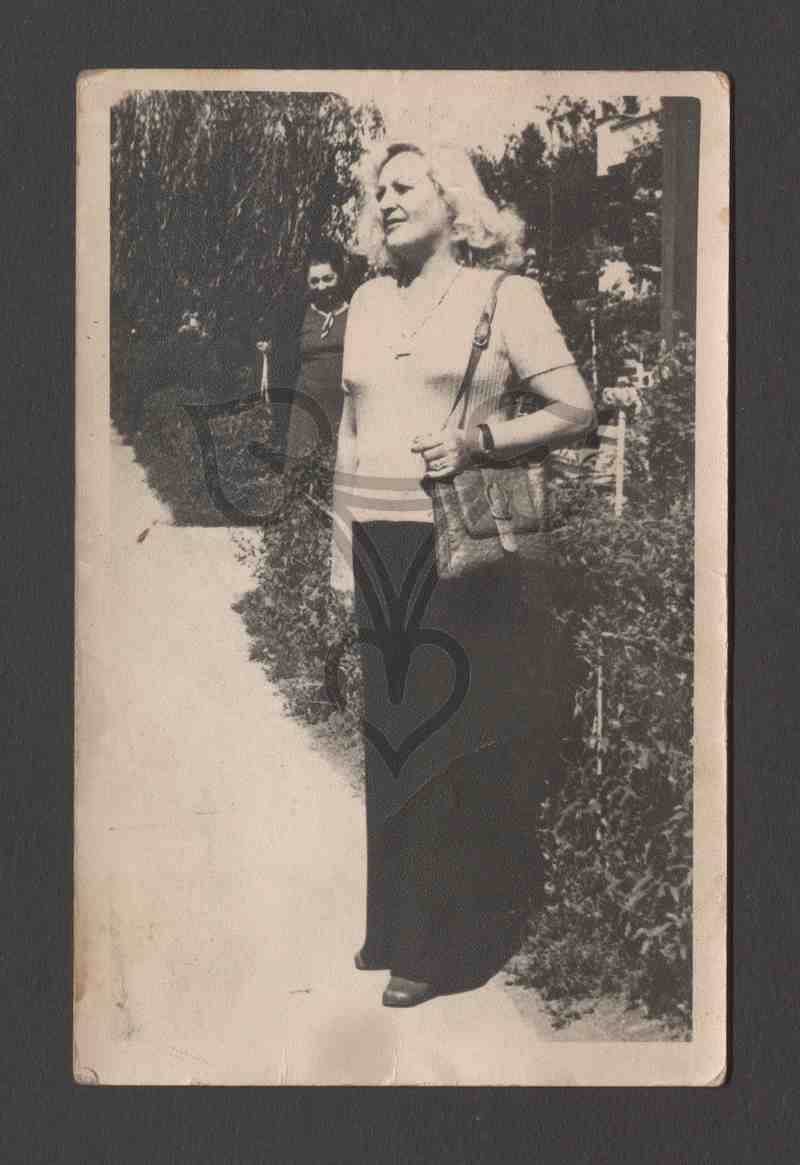 Die Blondine, mit schwarzer Hose und hellem Oberteil bekleidet, steht in einer Parkanlage nach links gewandt und blickt an der Kamera vorbei. Über der linken Schulter trägt sie eine Handtasche, am Handgelenk eine Armbanduhr. Von ihr verdeckt steht weiter hinten eine weitere, ältere Frau, dunkel gekleidet, und blickt in die Kamera. Im Hintergrund Bäume.