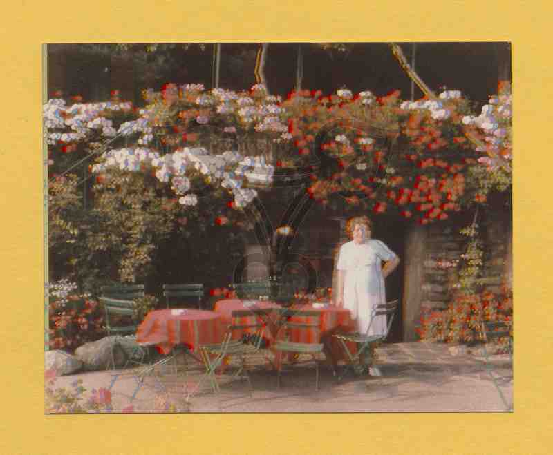 Die Frau steht im Freien auf der Terrasse eines Restaurants, trägt ein weißes Kleid und eine hellblaue Weste. Links neben ihr stehen runde, mit roten Tischdecken gedeckte Tische und grüne Klappstühle, hinter ihr eine mit Blumen reich dekorierte Gebäudewand.