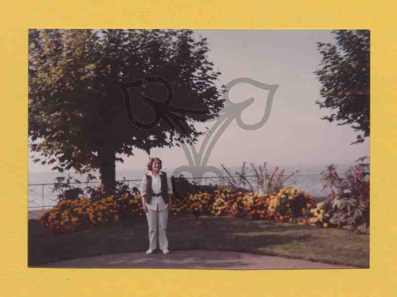 Die Frau steht in einem Park vor einer Grünfläche mit Blumenbeet und Bäumen. Sie trägt weiße Hose, Bluse, eine ärmellose schwarze Jacke mit schwarzem Gürtel und blickt rechts an der Kamera vorbei. Die Arme hängen locker neben dem Körper. Im Hintergrund Wasser und hellblauer Himmel.