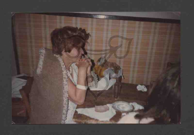 Die Frau sitzt in einem Zimmer nach links gewandt an einem gedeckten Tisch. Rechts von der Frau an dem karierten Wandbehang ein Plüschtier. In der rechten unteren Bildecke eine weitere Person, von der lediglich der halbe Hinterkopf zu erkennen ist.