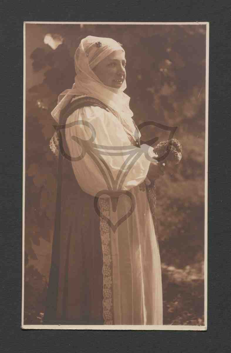 Sitzende Frau mit weißer Schürze, weißer Haube, weißer Bluse und dunklem Rock.