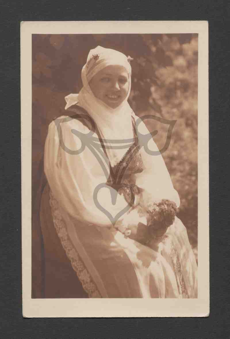 Sitzende Frau mit weißer Schürze, weißer Haube, weißer Bluse und dunklem Rock.