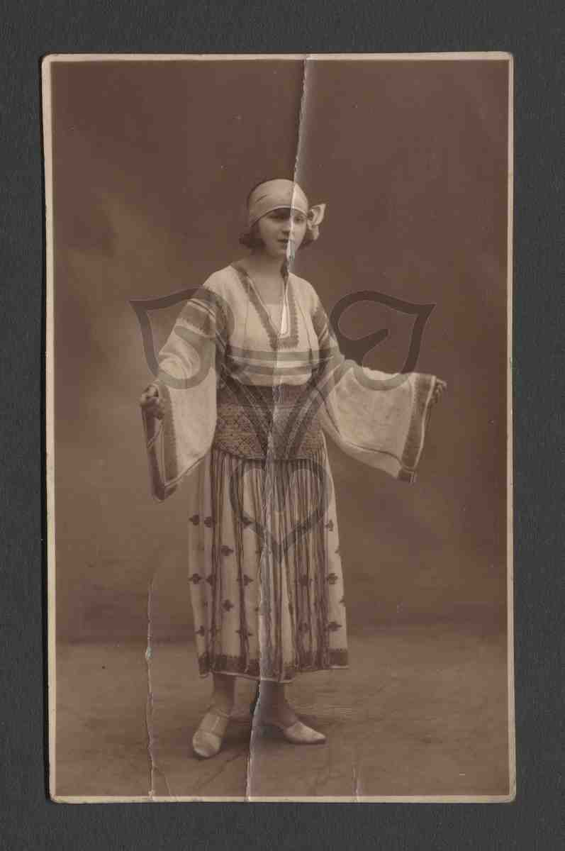 Studioaufnahme, neutraler Hintergrund. Die Frau steht aufrecht nach rechts gewandt und blickt in die Kamera. Sie trägt eine rumänische(?) Tracht.