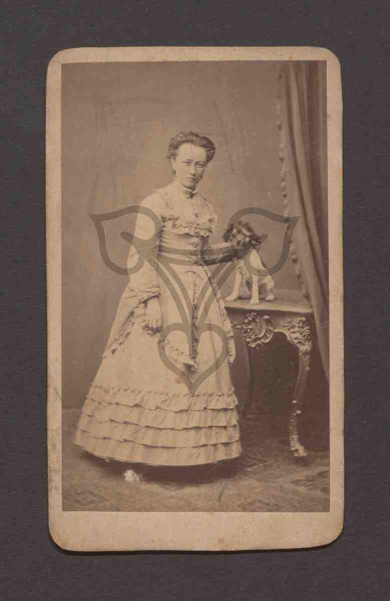 Studioaufnahme. Neutraler Hintergrund, Teppich auf dem Fußboden, Tisch und Vorhang Requisite. Die Frau sieht in die Kamera, ihr Körper ist aber halb Tisch und dem darauf auf den Hinterbeinen sitzendem Hund zugewandt, den sie mit der linken Hand streichelt. Rechts neben dem Tisch hängt ein Vorhang herab.