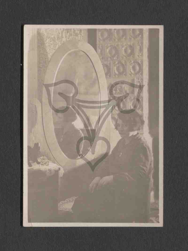 Die Frau sitzt halb zum Spiegel, halb zur Kamera gewandt auf einem Stuhl und blickt links an der Kamera vorbei. Im Spiegel ist ihr Spiegelbild zu sehen. Links neben dem Spiegel eine Anrichte mit Staubfänger, rechts ein Kachelofen.