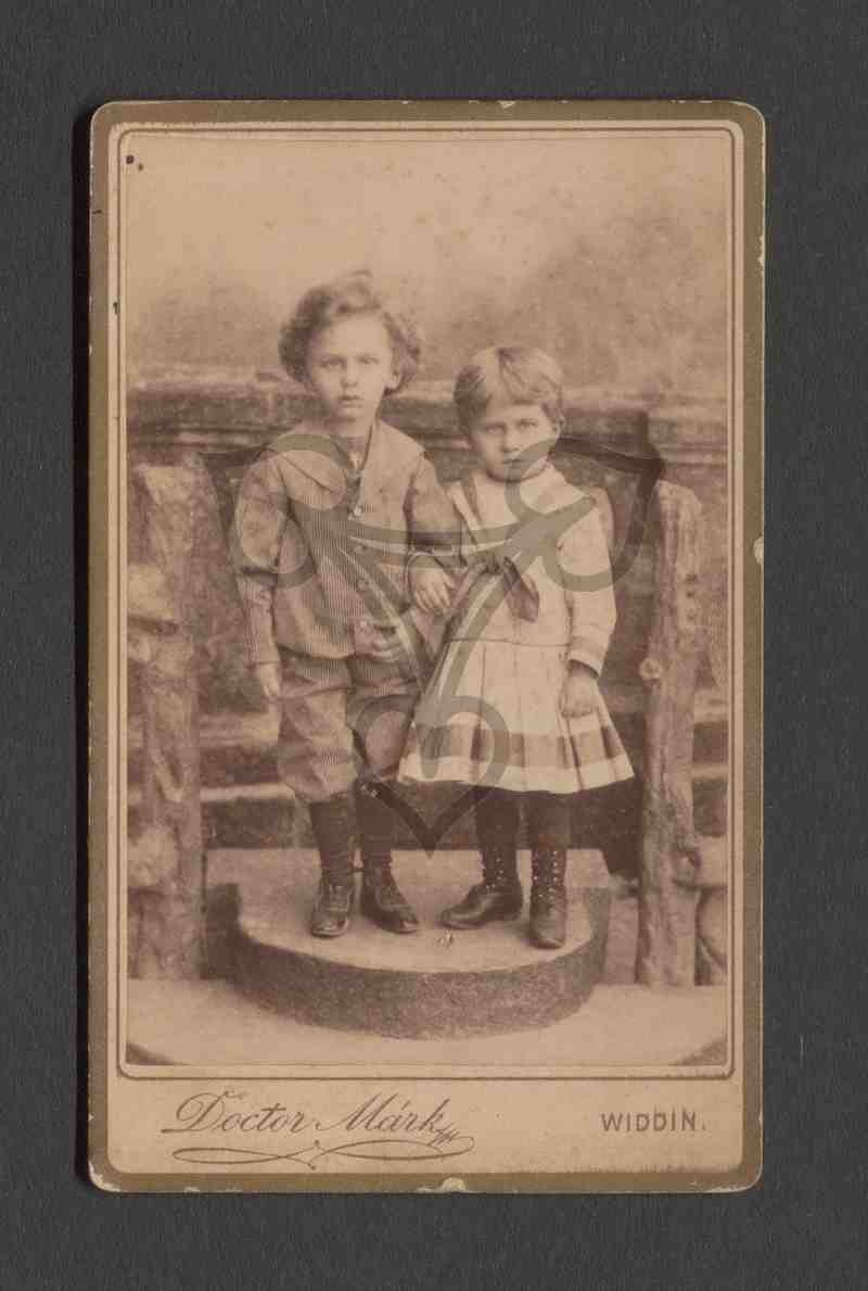 Studioaufnahme, gemalter Hintergrund, Balustrade Requisite. Das Geschwisterpaar steht vor einer Balustrade und blickt in die Kamera. Der junge steht links, ist in einen dunklen Anzug gekleidet und trägt Stiefel. Das Mädchen steht rechts, trägt ein helles Kleid mit bunt gestreiftem Halstuch und ebenfalls Stiefel. Sie hat sich bei ihrem Bruder eingehakt.