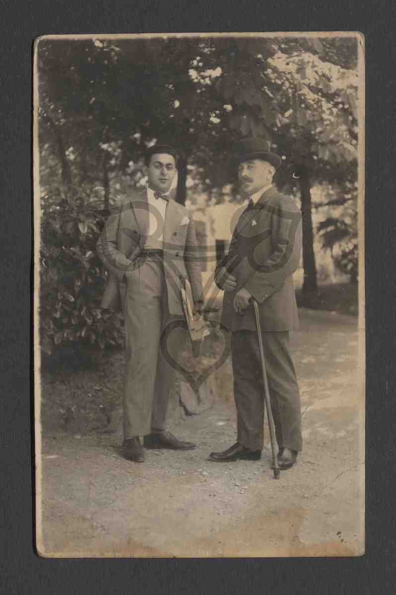 Zwei Männer stehen im Freien auf einem geschotterten Weg einander zugewandt und blicken in die Kamera. Der linke trägt schwarze Schuhe, einen grauen Anzug mit weißem Hemd und schwarzer Fliege, in der linken Hand hält er eine Zeitung, die rechte steckt in der Hosentasche. Der rechte trägt ebenfalls schwarze Schuhe, einen dunklen Anzug und schwarzen Hut. Die Hände stecken in Handschuhen, mit der linken stützt er sich auf einen Spazierstock. Hinter ihnen Bäume und Büsche, im Hintergrund ein Gebäude.