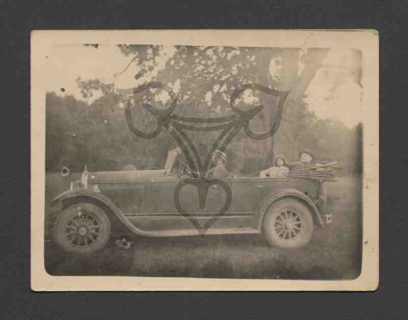 Im Fond eines offenen Wagens sitzt ein Paar, der Mann, in einem dunklen Anzug gekleidet, auf dem Rücksitz, die Frau in einem hellen Kleid links neben ihm. Beide blicken sie in die Kamera. Hinter dem Steuer sitzt der Schofför bekleidet mit einer grauen Jacke und einem Strohhut und blickt nach links. Der Wagen steht auf einer Grünfläche mit Fahrtrichtung nach links. Hinter ihm ein Baum, im Hintergrund, in einiger Entfernung, Wald.