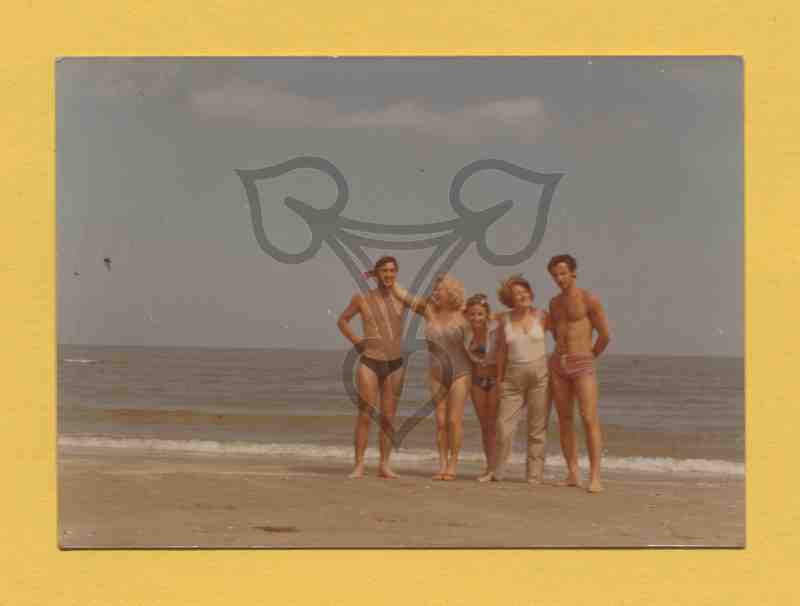 Drei Frauen und zwei Männer stehen nebeneinander in Badekleidung am Strand. Die beiden Männer flankieren die Frauen, alle haben sich mit den Armen umschlungen. Im Hintergrund Wasser.