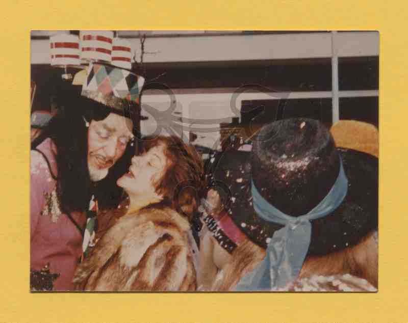 Ein Mann und mehrere zu Fasching verkleidete Frauen in einem Raum. Der Mann ganz links beugt sich etwas herab um zu verstehen, was die Frau rechts neben ihm, sagt. Die restlichen Personen sind nicht zu erkennen, da fast die gesamte rechte untere Bildhälfte von dem der sich dort befindenden Frau verdeckt wird.