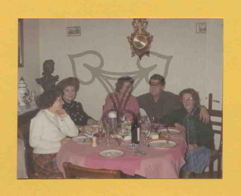 Vier Frauen und ein Mann sitzen in einem Zimmer um einen gedeckten Tisch verteilt. Auf der rosa Tischdecke liegen hellllila Servietten, weiße Teller mit Goldrand, Besteck, Gläser und Flaschen. An der Wand im Hintergrund hängen zwei kleine Bilder und Mittig eine goldene Uhr. An der Wand links steht eine Kredenz, auf der eine Büste und mehrere Porzellanfiguren stehen.