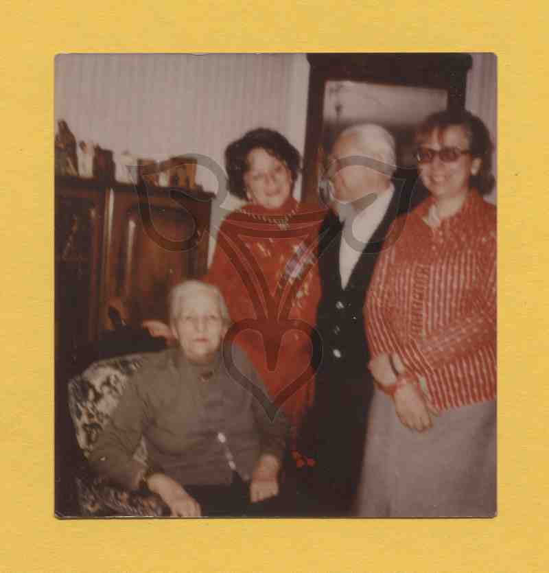 In einem Zimmer befinden sich vier Personen, ganz links sitzt eine Frau in einem Sessel, rechts neben ihr stehen eine Frau, ein Mann und eine weitere Frau. Die beiden äußeren Frauen blicken in die Kamera. Hinter der sitzenden Frau ein halbhoher Schrank, weiter recht ein Spiegel.