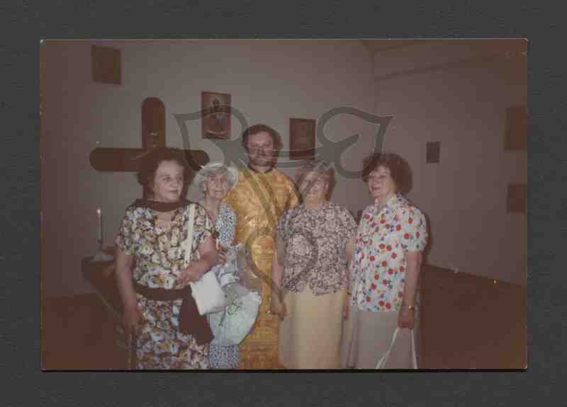 In einem Raum (Kirche?) stehen um einen Mann gruppiert vier ältere Frauen. Alle sind bunt bekleidet und blicken in die Kamera. Der Mann trägt die gelbe Robe eines Priesters. An der Wand hängt ein großes Holzkreuz und mehrere Ikonen.