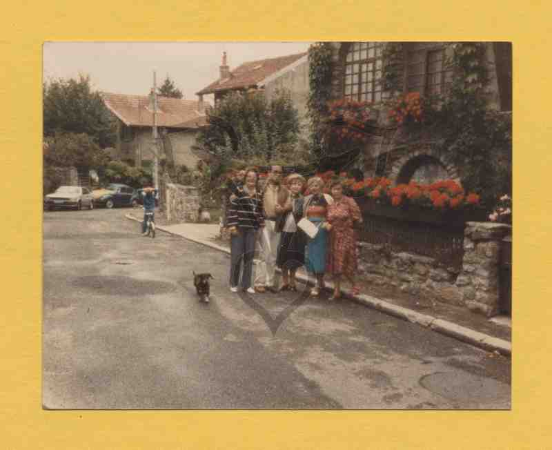 Vor einem Gebäude auf einer regennassen asphaltierten Straße stehen nebeneinander vier Frauen und ein Mann und blicken in die Kamera. Der Mann hat der Frau ganz links den Arm um die Schultern gelegt, bei der Frau rechts neben sich hat er sich eingehakt. Links neben der linken Frau ein Hund, hinter der Gruppe ein Kind auf einem Fahrrad, das der Gruppe den Rücken zuwendet. Der Zaun rechts neben der Gruppe besteht aus gemauerten Pfosten, einer halbhoch gemauerten Mauer und darüber senkrechten Holzbrettern, an deren oberen Ende sich auf der Innenseite rechteckige Blumenkästen befinden, aus denen dicht wachsende rote Blumen hervorblicken. Die Fassade des Gebäudes ist mit Efeu bewachsen, vor den Fenstern hängen ebenfalls Blumenkästen mit roten Blumen. Im Hintergrund weitere Gebäude.