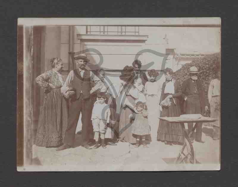Vor einem Gebäude im Freien ist eine Gruppe aus jüngeren und älteren Personen nebst Kindern zu sehen. Am linken Bildrand kann man eine Eingangstüre erkennen, hinter den Personen eine Hauswand mit Fenster und Dachrinne, weiter rechts eine Hecke und dahinter weitere Hauswände. Vor der Gruppe steht ein kleiner, quadratischer Tisch.