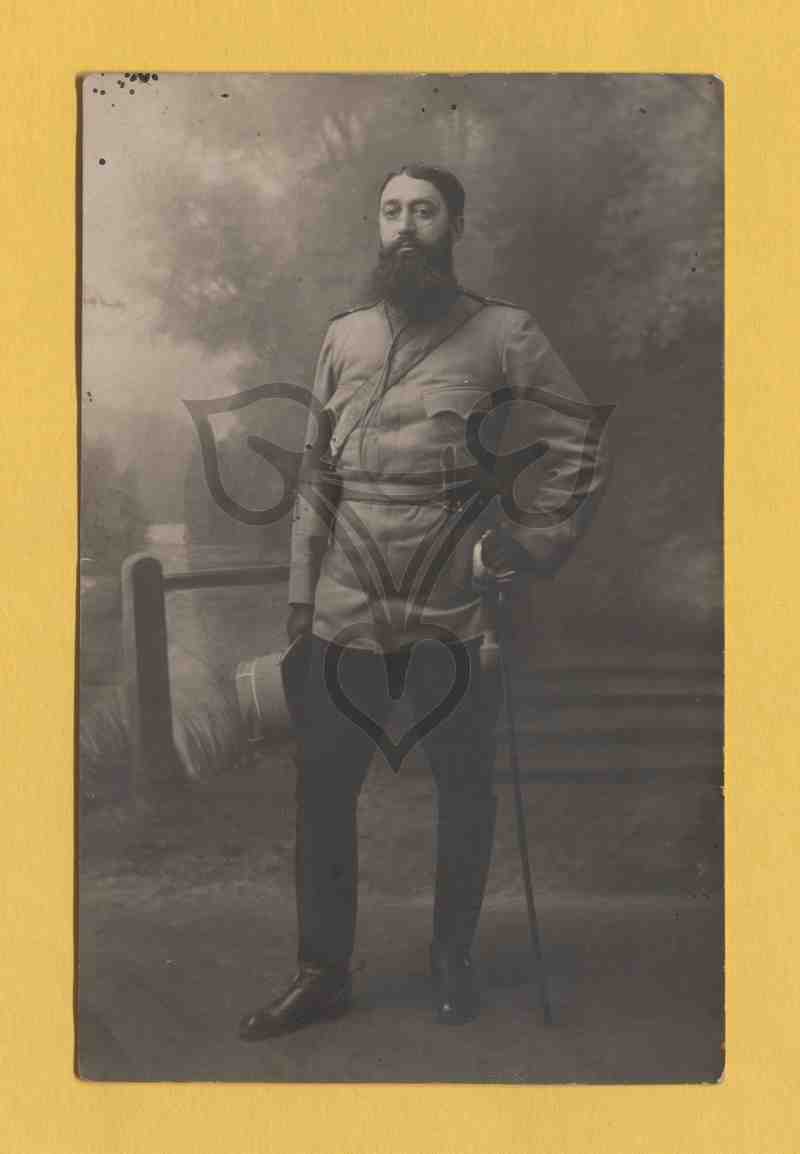 Studioaufnahme. Der vollbärtige Mann steht auf sein linkes Bein gestützt, das rechte leicht Vorgestellt. In der linken Hand hält er den in seiner Scheide steckenden Säbel, in der rechten die Schildkappe. Ebenfalls rechts an einem Gürtel oberhalb des Bauches der Feldstecher. Um den Hals hängt eine Kordel, an der die Pistole gesichert ist; diese steckt in einem Halfter am Bauchgürtel an der linken Seite. An den Stiefeln Sporen.
