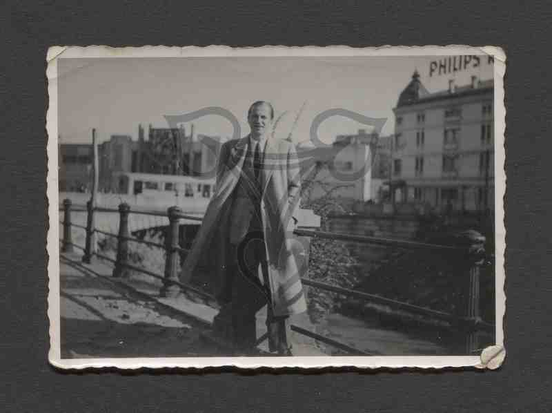 Der Mann in grauem Anzug, weißem Hemd, dunkler Krawatte und langem grauen Mantel, steht auf einem Bürgersteig. Hinter ihm eine Geländer, dahinter eine Senkung, über die (am linken Bildrand) eine Brücke führt. Im Hintergrund mehrere Gebäude.