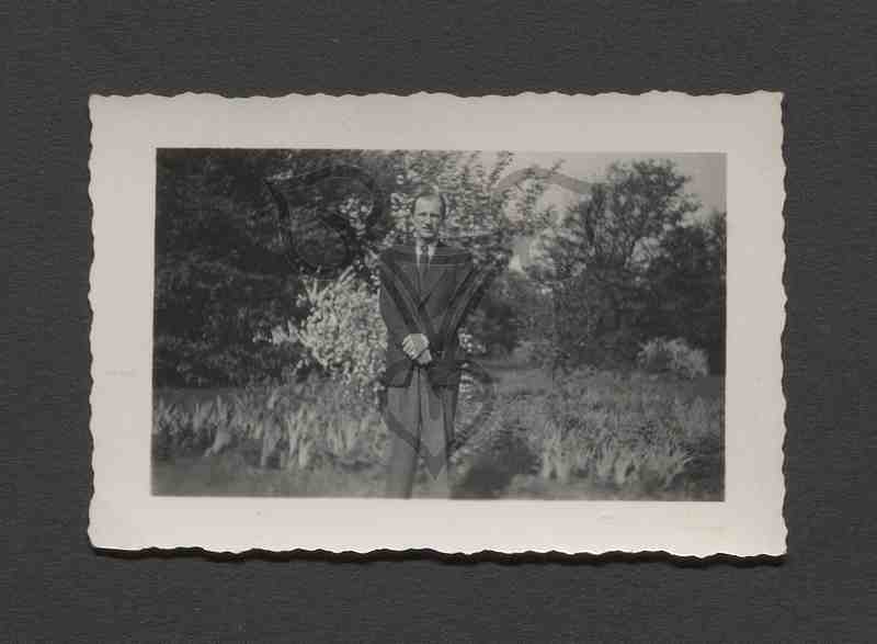 Der mit graue Hose, schwarzer Jacke und Krawatte sowie weißem Hemd bekleidete Mann steht in einem Park aufrecht da, die Hände vor dem Bauch gefaltet. Hinter ihm Blumenbeete, dahinter Bäume.