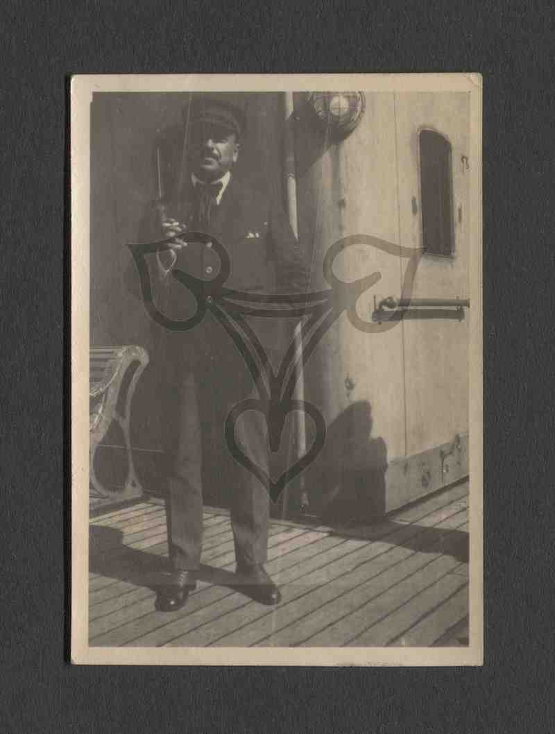 Der in einen dunklen Anzug gekleidete Mann steht vermutlich an Deck eines Dampfers. Zwischen den Fingern der rechten Hand hält er eine Zigarette.