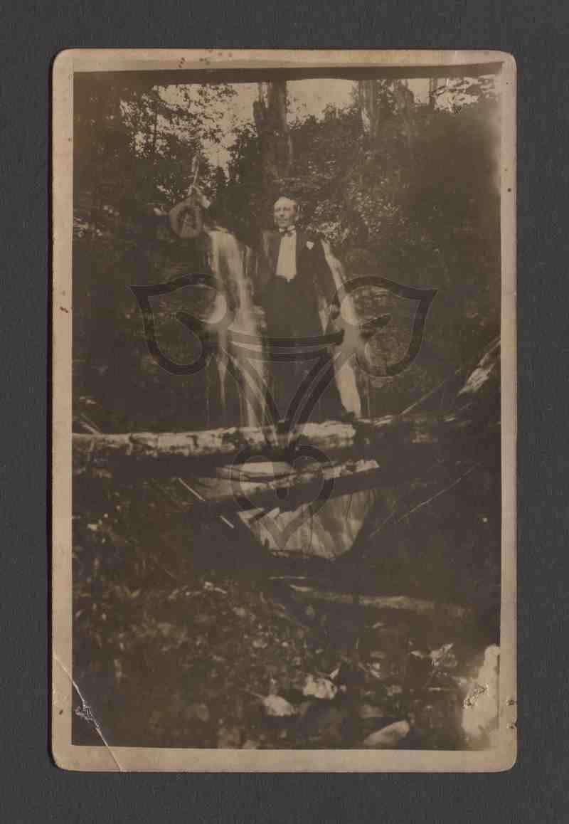 Ein Mann steht mit auseinander gespreizten Beinen auf einem waagerecht über einem Bach gefallenen Baumstamm, ist in einen schwarzen Anzug mit weißem Hemd und schwarzer Fliege gekleidet, hält in der erhobenen rechten Hand eine Mandoline und in der linken, die locker an Körper hängt, einen schwarzen Hut. Hinter ihm ein Wasserfall, links und rechts Bäume.