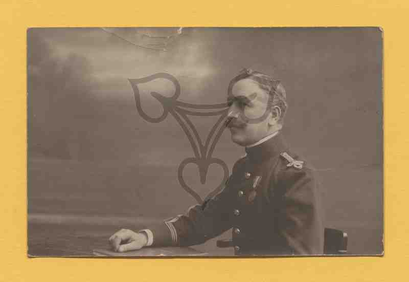 Studioaufnahme, gemalter Hintergrund, Tisch und Stuhl Requisite. Der Mann sitzt nach links gewandt auf einem Stuhl, trägt eine dunkle Uniform, hat den rechten Unterarm auf eine Tischplatte gestützt, den linken Arm locker herabhängen und blickt links an der Kamera vorbei.
